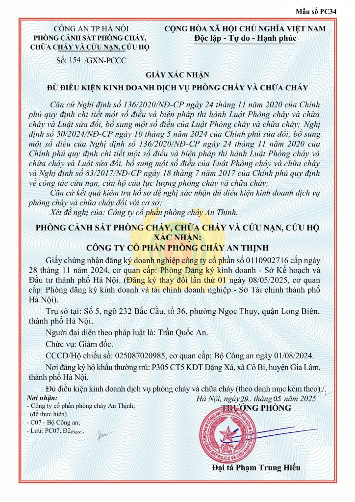 Công ty cổ phần phòng cháy An Thịnh rất tự hào và vinh dự khi